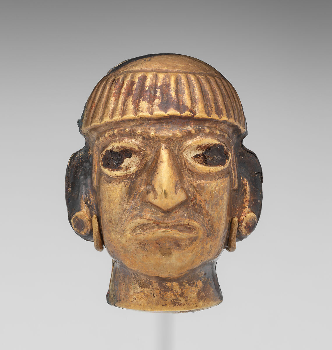 This head is one of at least six likely from the same necklace (see also MMA 1991.419.52, .53, .54, .55, .56). The beads depict the head of a high-status individual of ancient Peru’s Moche culture. Made by shaping a sheet of hammered gold over a mold, the individuals wear circular ear ornaments, a feature indicative of their social position. Pairs of perforations on either side of the head suggest the beads were double strung, as was customary for Moche necklaces (see, for example, Alva and Donnan, 1993: 93, fig. 95).
