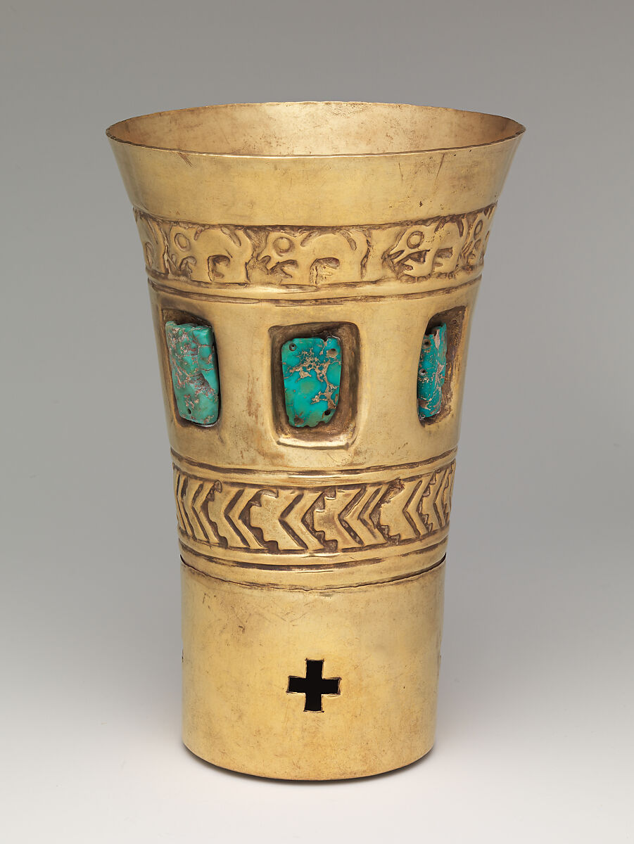 Lambayeque beakers also sometimes feature precious stones, as illustrated by the vessel seen here, which has seven turquoise inlays that circumscribe the upper-middle register of the beaker. Above these inset stones is a series of stylized zoomorphs with beak-like mouths shown in profile. Visual allusions to seabirds and other marine animals appear throughout Lambayeque art and architecture, often denoting the importance of maritime resources and the necessity of life-sustaining water on the desert coast of Peru.