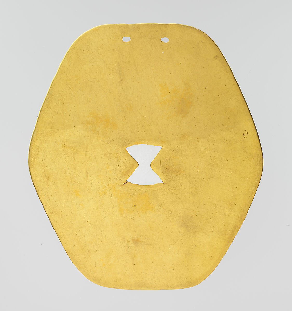 In creating the plaque, it is uncertain whether the metalworkers began with a pre-formed blank of metal, hammered or cast, or worked directly from nuggets of gold that they joined together through hammering. In turn, the metalworkers hammered the gold to its present thinness and chiseled the object to its hexagonal shape. They also chiseled away the metal at the center to form the hourglass shape. On the reverse, the presence of a slight depression that outlines the shape suggests that the metalworkers undertook chiseling from this side. They used a punch to make the two perforations at top. Polishing was likely carried out at some point, or at several points, after the object’s excavation.
