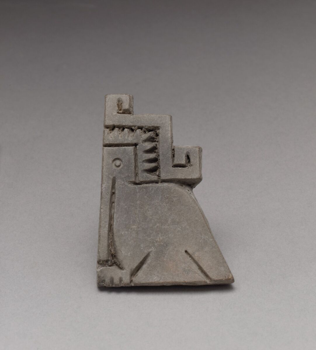 Ceramic stamps, both cylindrical and flat, are thought to have been used to decorate textiles and/or the human body. They were made by many Ecuadorian peoples from the beginning of the first millennium B.C. until about 700 A.D., when patterns on textiles began to be woven into the fabric structure rather than stamped on to it. The stamps are carved into a wide range of motifs, from animal, human, and floral to imaginative geometric and abstract designs. This flat stamp, in an almost cubist approach to the form, depicts a bird with an angular step-fret design behind its head. The head, crest, and long beak are shown in profile while the body with partially spread wings and tail is shown from the back and one foot is seen from above. The stamp has a small handle in back.