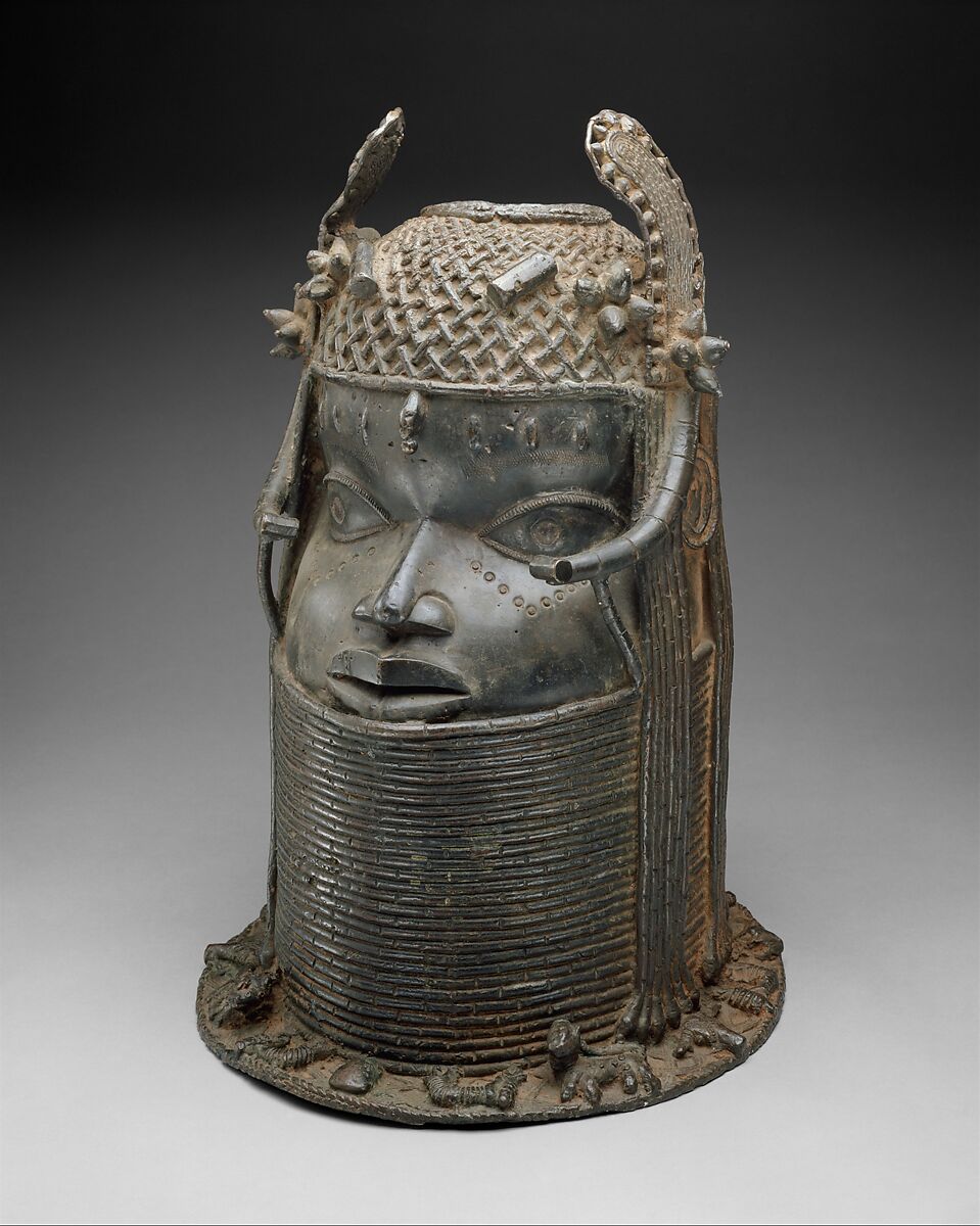 This example of a brass casting of a Benin head may date to the mid-nineteenth century. The extreme degree of stylization, swollen cheeks and enlarged eyes, the size of the flange at the base, the weight of the casting, and the winglike projections attached to the crowns are characteristic of brass casting during this later period of Benin royal court.