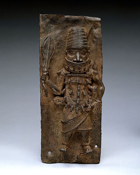 This artwork was restituted in February 2021. It is no longer in the museum’s collection.At its origins, the centralized city-state of Benin was founded by Edo-speaking peoples. The accounts by official court historians and descriptions provided by visitors evoke a vibrant cultural center continually redefined by its leadership through shifting internal and external power dynamics. According to oral tradition, circa 1300, Edo chiefs are reputed to have reached out to the leader of neighboring Ife, Oranmiyan, to establish a new divinely sanctioned royal dynasty. Since then, the investiture of Benin’s rulers to the title of obas has conferred upon them at once a role of chief priest officiating in important religious ceremonies and presiding over an elaborate structure of palace officials. During the fifteenth century reign of Oba Ewuare, Benin’s armies were formed and the fortification of its capital with a massive wall undertaken. In parallel, delegations of Portuguese traders assiduously sought to secure exclusive commercial treaties with this leader of the region’s most powerful polity. At its height in 1500, Benin’s authority extended to the Niger delta in the east and to the coastal lagoon of Lagos in the west. Its major exports of pepper, textiles, and ivory were exchanged for copious quantities of imported metals. This access to an influx of brass led to an explosion of creativity by court artists who transformed it into works for the palace ranging from ancestral portraits, positioned on royal altars, to decorative plaques depicting the oba, his courtiers, and foreign interlocutors. From the earliest such exchanges, those Europeans commissioned exquisite ivory artifacts from Edo carvers for princely collections back home.