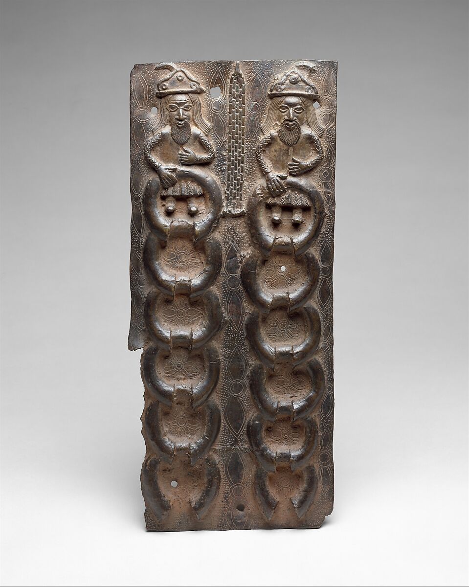 This is an example of the series of cast brass plaques that historically hung on the wooden pillars of the Benin royal palace. This particular work reflects the association made by the Edo people between the Portuguese, depicted with sharp noses, long hair, and unique dress, and wealth, represented by the brass manillas (coins).