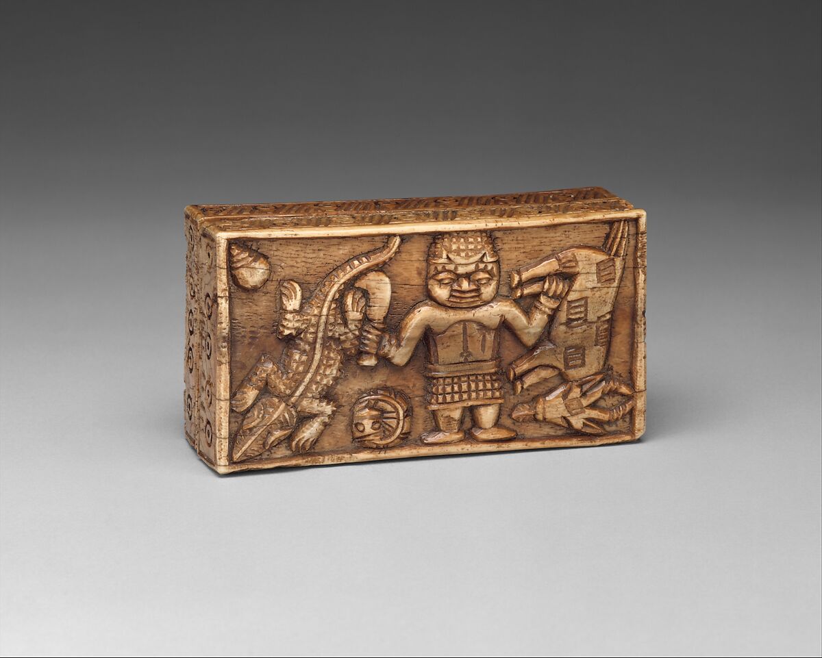 At its origins, the centralized city-state of Benin was founded by Edo-speaking peoples. The accounts by official court historians and descriptions provided by visitors evoke a vibrant cultural center continually redefined by its leadership through shifting internal and external power dynamics. According to oral tradition, circa 1300, Edo chiefs are reputed to have reached out to the leader of neighboring Ife, Oranmiyan, to establish a new divinely sanctioned royal dynasty. Since then, the investiture of Benin’s rulers to the title of obas has conferred upon them at once a role of chief priest officiating in important religious ceremonies and presiding over an elaborate structure of palace officials. During the fifteenth century reign of Oba Ewuare, Benin’s armies were formed and the fortification of its capital with a massive wall undertaken. In parallel, delegations of Portuguese traders assiduously sought to secure exclusive commercial treaties with this leader of the region’s most powerful polity. At its height in 1500, Benin’s authority extended to the Niger delta in the east and to the coastal lagoon of Lagos in the west. Its major exports of pepper, textiles, and ivory were exchanged for copious quantities of imported metals. This access to an influx of brass led to an explosion of creativity by court artists who transformed it into works for the palace ranging from ancestral portraits, positioned on royal altars, to decorative plaques depicting the oba, his courtiers, and foreign interlocutors. From the earliest such exchanges, those Europeans commissioned exquisite ivory artifacts from Edo carvers for princely collections back home.