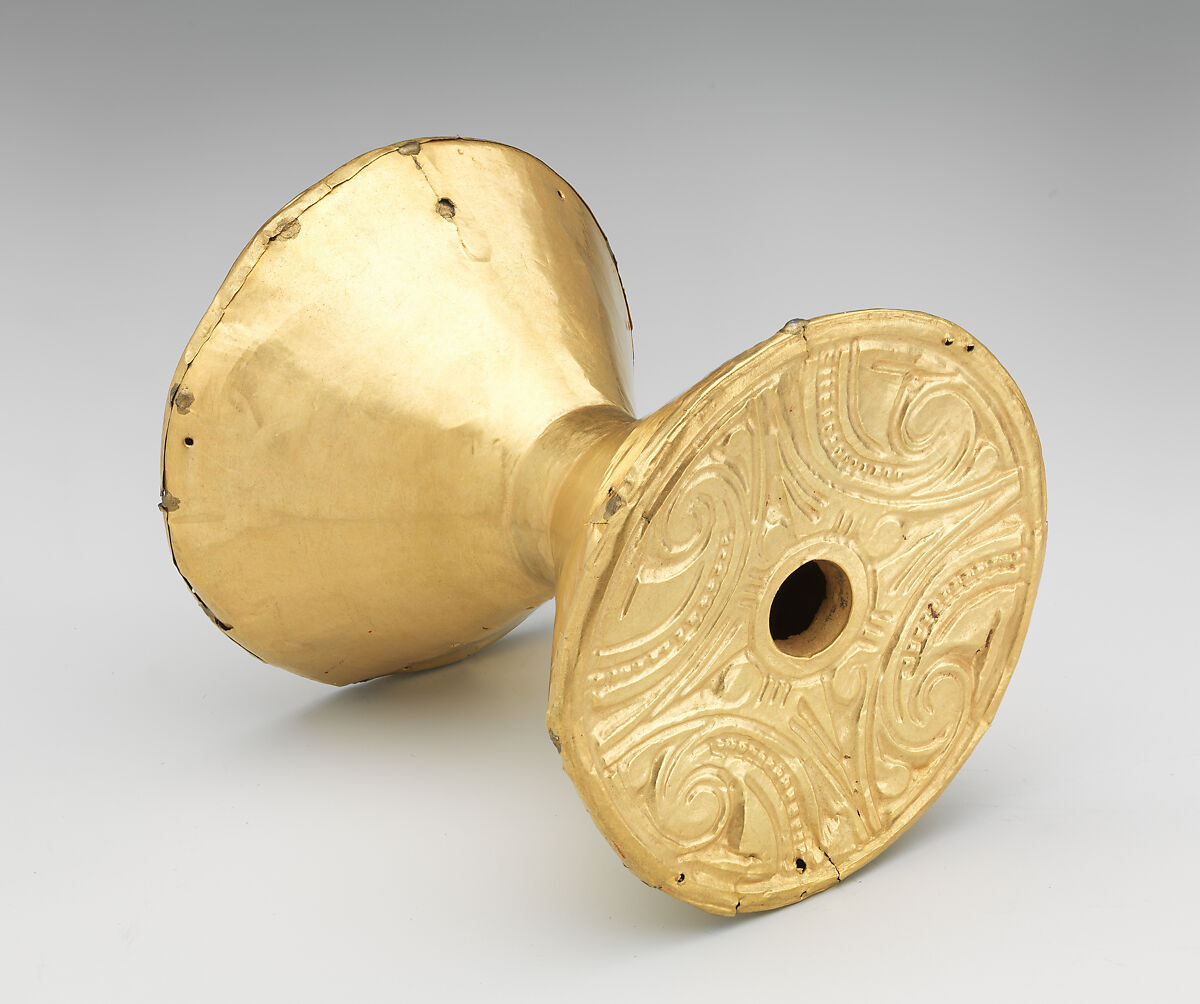 Calima leaders of the Yotoco period in the Cauca Valley region of southwest Colombia wore resplendent regalia in life and in death. These included diadems, pectorals, nose ornaments, and elaborate, multicomponent ear ornaments terminating in large, circular pendants. Biconical or spool-shaped objects with decorated ends such as these were inserted through the earlobes, and large concave disks gold would be suspended through an opening at the center of these with thin gold wires. Made of lightweight hammered gold sheet, the biconical elements probably had interior wooden supports (now lost) which would have strengthened them and allowed for the suspension of the concave disks (not shown here, but see 66.196.24 for an example of such multi-component ear ornaments depicted on a headdress diadem).
