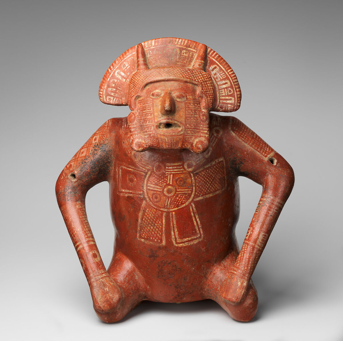 Between the third century BCE and second century CE, the people in the west Mexican state of Colima buried their honored dead with sculptural ceramic vessels in the form of human and animal figures. In the same region in later centuries, ceremonial vessels were given simpler form with a strong emphasis on polychrome surface decoration. This pair of male and female figure vessels, said to have come from the site of El Chanal in Colima, combines the early with the later tradition. Both vessels have large flared openings in back of their necks. From humplike protuberances on their backs project long-tapering spouts. The surfaces are covered with red slip and embellished with detailed red-on-cream designs. The flat, square faces with hatchet noses appear masklike and bear different motifs, while the crescent headdresses with horns are identical. The female figure holds a child that looks up to her, and has legs that wrap around her waist.