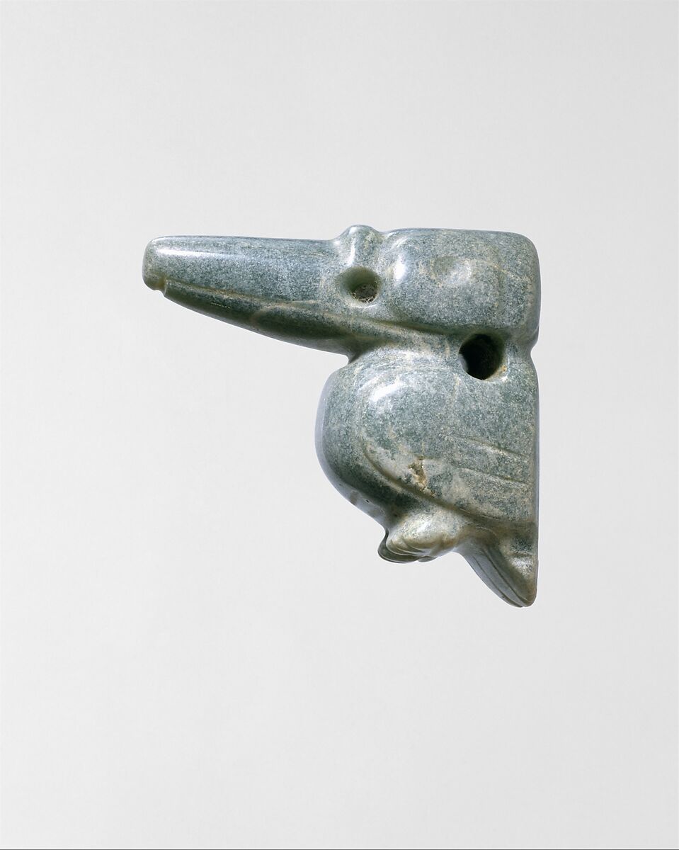 Archaeological evidence suggests that jade bird-form pendants were made and treasured as early as 500 BCE and remained favorites for hundreds of years. Bird imagery is pervasive throughout this long period, as was the preference for fashioning ornaments out of green-colored stones. Jadeite, which was principally used in Costa Rica, came in many green tonalities, from pale blue-green—as seen here—to intense, almost black greens. This engaging fat bird with a long straight beak is worked almost in profile. Made to be viewed from both sides and suspended through a hole in its neck, it may also have had an additional ornament suspended from its own beak. The pendant is reported to be from Guanacaste Province in northwestern Costa Rica.