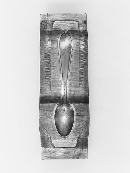This die was used to form the lower portion of The Hudson-Fulton Celebration souvenir spoon of which there are four examples, 1983.134.1–.4, in the collection of the Museum. The rectangular die has a concave pattern for the back of the spoon. The die for the upper portion of the spoon, 1985.191.9a, is also owned by the Museum.