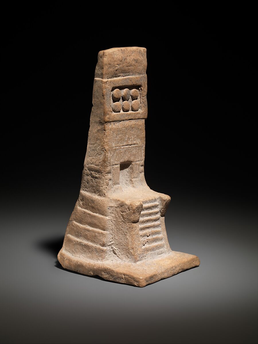Aztec temple models replicate key details of their full-size counterparts and may have acted as stand-ins for these buildings or served as earthly homes for deities. Some include a figure at the summit, perhaps representing a deity, a deity impersonator, or even a personification of the temple itself. Most of these models are square from the base through the summit. Examples with a circular base echo the rounded structures of temples dedicated to the wind god, Ehecatl. Made in considerable numbers with the use of press molds, these models, like the Aztec temples, were once painted in bright colors.