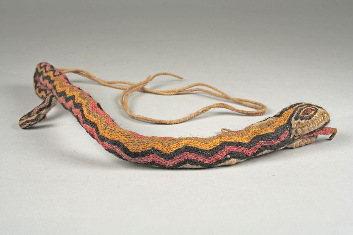 This exquisite three-dimensional textile representation of a serpent is from the South Coast of Peru and was likely fabricated in the 16th century. With a sinuous body, elliptical-concentric eyes, open red mouth, and protruding tongue, the snake threatens us, while at the same time its colorful body, with its lively red, yellow, black, and light brown zigzag lines, engages us. A double-braided rope is tied to the distal end, while a braided ring is inserted on the ventral side near the head, and would be used to secure the effigy snake. Although the function of this serpent is a matter of discussion, early colonial chronicles shed light on its likely use and meaning. For example, the anthropologists Tom Zuidema (1967) and Anne-Marie Hocquenghem (1997, 2008) have written essays about the symbolism of the serpent in the Inca Empire. In a ritual combat known as ayllar, snakes made of wool were used as projectiles. This effigy snake may have been worn around the neck—a powerful personal adornment of the paramount Inca and his allies—until it was needed as a weapon. The wearer would then grab the cord, swing the snake, and hurl it in the direction of the opponent. The heavy head would propel the figure forward. The simultaneous release of many would produce a scenario of “flying snakes” thrown at enemies.