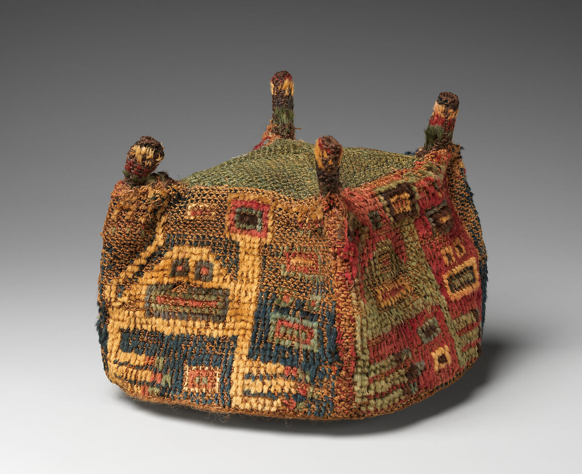 Finely woven, brightly colored hats, customarily featuring a square crown, four sides, and four pointed tips, are most frequently associated with two ancient cultures of the Andes: the Wari and the Tiwanaku. The Wari Empire dominated the south-central highlands and the west coastal regions of what is now Peru from 500–1000 A.D. The Tiwanaku occupied the altiplano (high plain) directly south of Wari-populated areas around the same time, including territory now part of the modern country of Bolivia. The cultures not only developed and flourished as contemporaries, but also occupied adjacent lands for nearly four centuries. A Wari ceremonial center called Cerro Baúl was located a mere five miles from Tiwanaku-settled fields in the Moquegua Valley of Peru. The two cultures likely encountered each other at Cerro Baúl and elsewhere, but the nature of these interactions remains largely unknown.