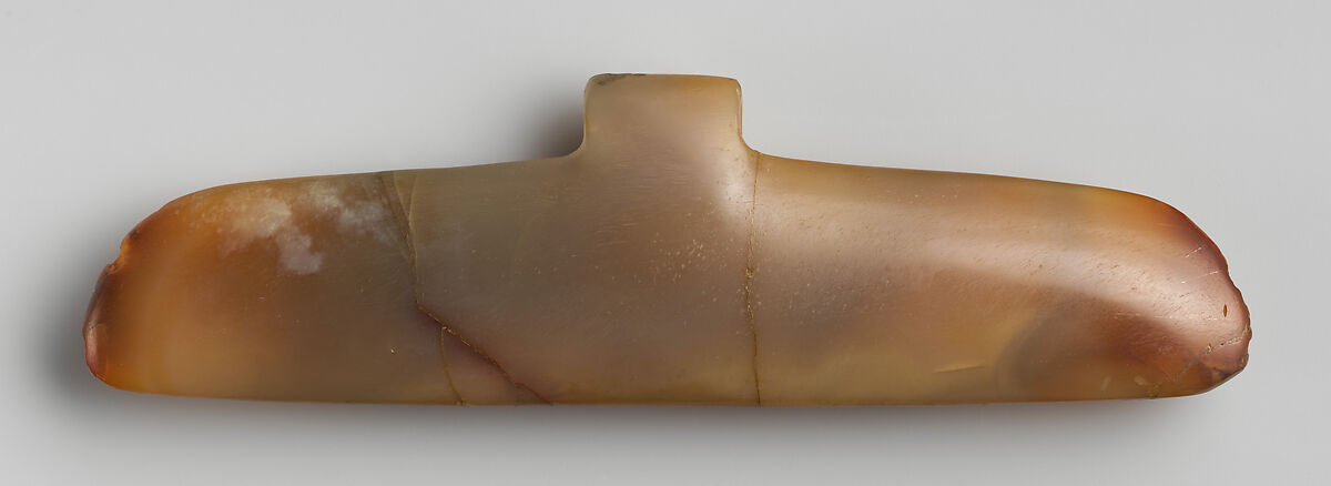 Winged pendants are found across a vast area from Mesoamerica to Colombia, including Costa Rica and Panama. Although the shape is extremely simple, the outline resembles an abstract representation of a bat, hence the name ‘winged pendant’. The small protuberance in the middle is perforated for suspension with a cord. A variety of materials was employed to make these pieces, such as jadeite, quartz, gold, and even ceramics. The style and dimensions of winged pendants (between10 to 15 cm long) are consistent regardless of the raw material used or where the pendant was made.