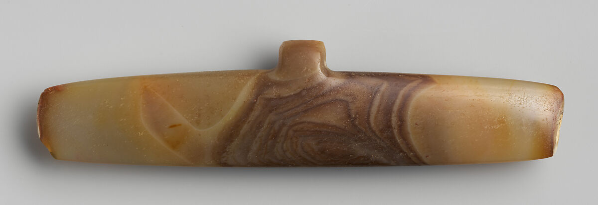 Winged pendants are found across a vast area from Mesoamerica to Colombia, including Costa Rica and Panama. Although the shape is extremely simple, the outline resembles an abstract representation of a bat, hence the name ‘winged pendant’. The small protuberance in the middle is perforated for suspension with a cord. A variety of materials was employed to make these pieces, such as jadeite, quartz, gold, and even ceramics. For example, this pendant was made from agate, and the artist highlighted the beautiful marbling within the stone. The style and dimensions of winged pendants (between10 to 15 cm long) are consistent regardless of the raw material used or where the pendant was made.
