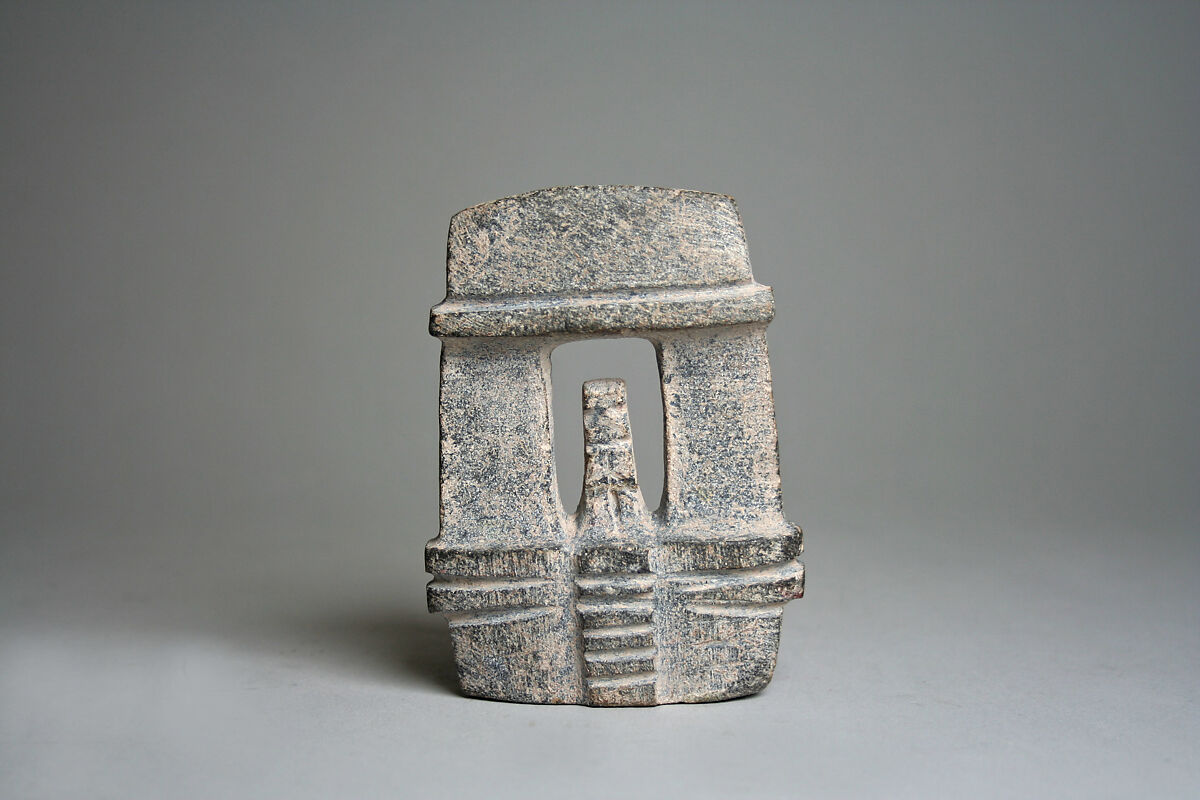 Mezcala models may have served multiple functions over time, in keeping with the Mesoamerican custom of repurposing or re-carving stone objects. Oblong-shaped models (see MMA 1994.35.704), or ones with curved bases (see MMA 1994.35.633), for example, may have been re-carved from celts, ritual tools of great symbolic importance. Several have holes drilled into the base, which could have been used to fasten them with fiber to a larger item such as a ritual bundle, a practice widely known in archaeological and ethnographic contexts in Mesoamerica (see MMA 1994. 35.700). Offerings of Mezcala stone objects in the Templo Mayor, the sacred center of the Aztec capital, Tenochtitlan, built between 1325 and 1519, underscore the importance of these works as a continuation of tradition, as heirlooms, or as emulations of an ancient style.