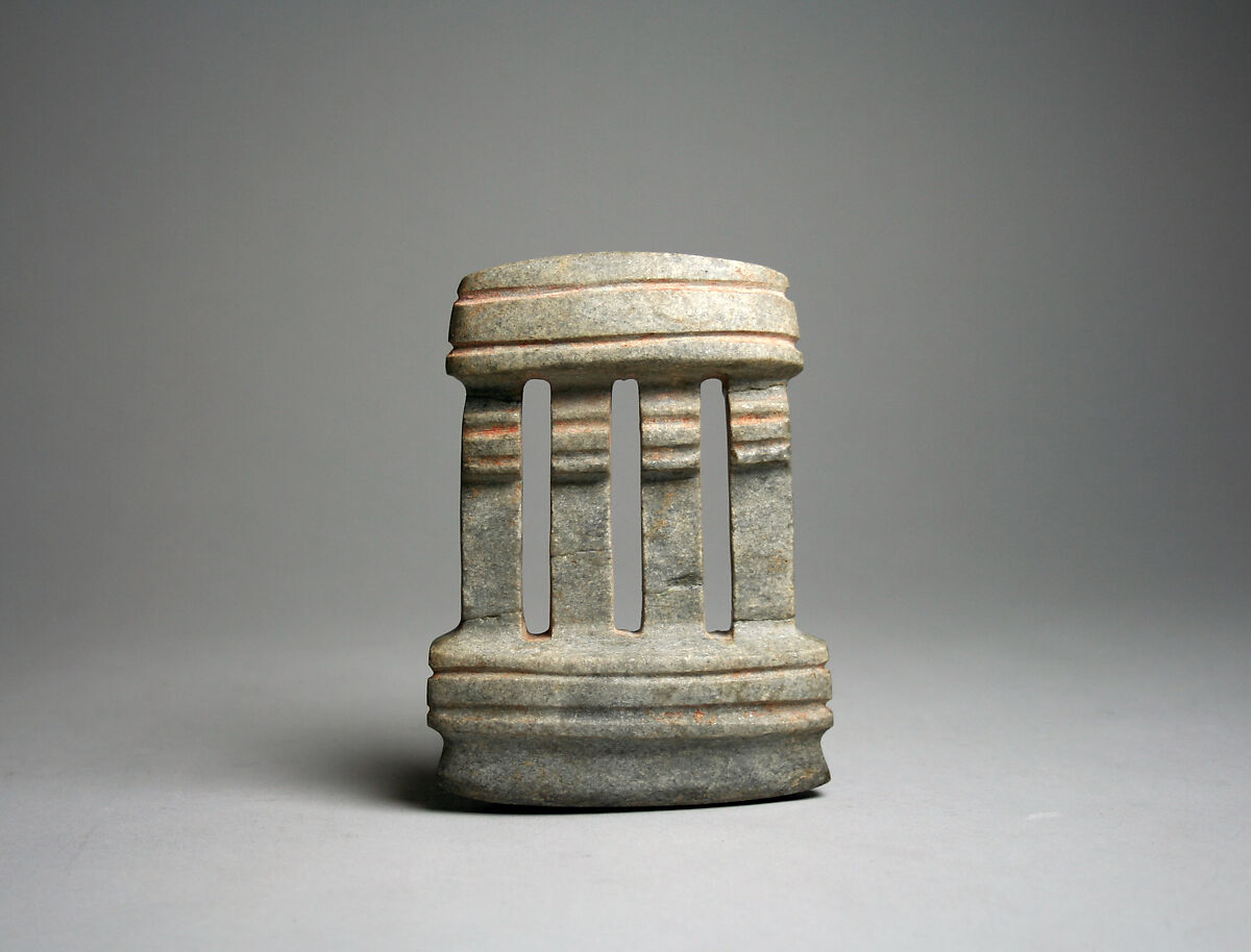 Stone architectural models in the Mezcala style primarily come from the present-day state of Guerrero in southwest Mexico. A particularly long-lived tradition, these works may have been produced over some one thousand years, beginning as early as 500 BCE. Little is known about their archaeological contexts, and there are few points of reference with surviving architecture in the region. It is possible that models with pillars reference buildings with stone columns, such as those from Cuetlajuchitlán.