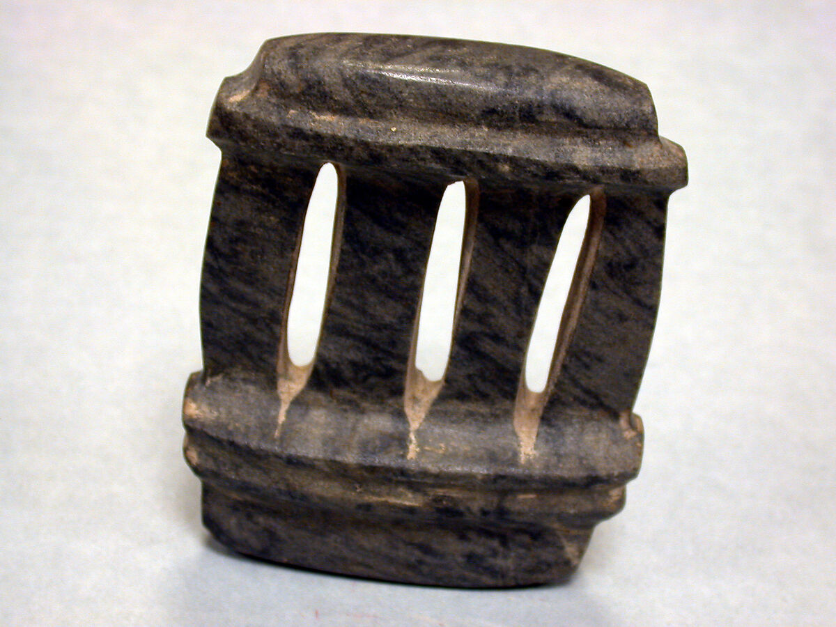 Mezcala models may have served multiple functions over time, in keeping with the Mesoamerican custom of repurposing or re-carving stone objects. Oblong-shaped models (see MMA 1994.35.704), or ones with curved bases (see MMA 1994.35.633), for example, may have been re-carved from celts, ritual tools of great symbolic importance. Several have holes drilled into the base, which could have been used to fasten them with fiber to a larger item such as a ritual bundle, a practice widely known in archaeological and ethnographic contexts in Mesoamerica (see MMA 1994. 35.700). Offerings of Mezcala stone objects in the Templo Mayor, the sacred center of the Aztec capital, Tenochtitlan, built between 1325 and 1519, underscore the importance of these works as a continuation of tradition, as heirlooms, or as emulations of an ancient style.