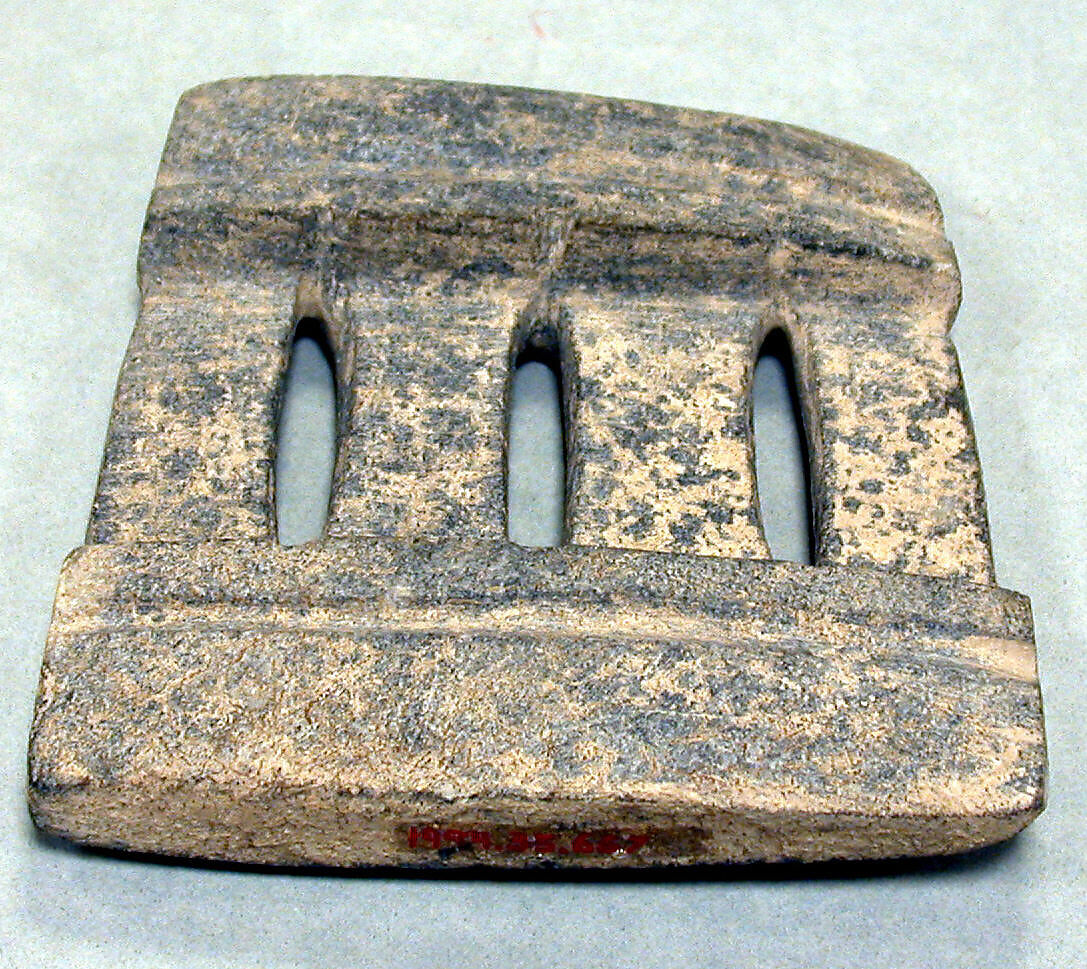 Mezcala models may have served multiple functions over time, in keeping with the Mesoamerican custom of repurposing or re-carving stone objects. Oblong-shaped models (see MMA 1994.35.704), or ones with curved bases (see MMA 1994.35.633), for example, may have been re-carved from celts, ritual tools of great symbolic importance. Several have holes drilled into the base, which could have been used to fasten them with fiber to a larger item such as a ritual bundle, a practice widely known in archaeological and ethnographic contexts in Mesoamerica (see MMA 1994. 35.700). Offerings of Mezcala stone objects in the Templo Mayor, the sacred center of the Aztec capital, Tenochtitlan, built between 1325 and 1519, underscore the importance of these works as a continuation of tradition, as heirlooms, or as emulations of an ancient style.