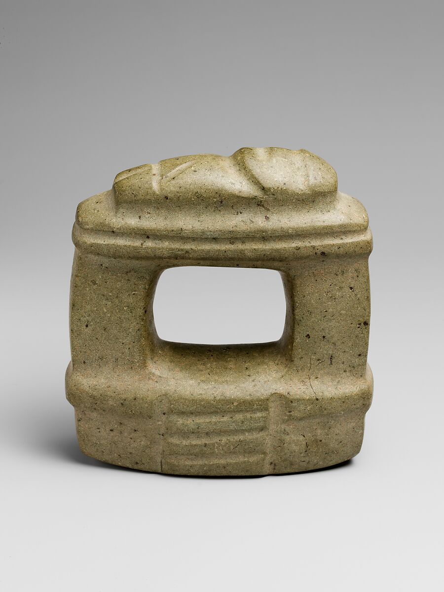 Mezcala models may have served multiple functions over time, in keeping with the Mesoamerican custom of repurposing or re-carving stone objects. Oblong-shaped models (see MMA 1994.35.704), or ones with curved bases (see MMA 1994.35.633), for example, may have been re-carved from celts, ritual tools of great symbolic importance. Several have holes drilled into the base, which could have been used to fasten them with fiber to a larger item such as a ritual bundle, a practice widely known in archaeological and ethnographic contexts in Mesoamerica (see MMA 1994. 35.700). Offerings of Mezcala stone objects in the Templo Mayor, the sacred center of the Aztec capital, Tenochtitlan, built between 1325 and 1519, underscore the importance of these works as a continuation of tradition, as heirlooms, or as emulations of an ancient style.