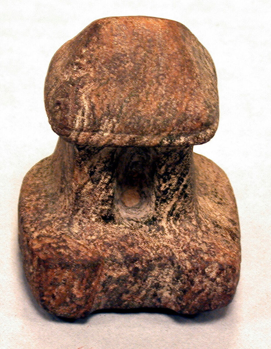 Mezcala models may have served multiple functions over time, in keeping with the Mesoamerican custom of repurposing or re-carving stone objects. Oblong-shaped models (see MMA 1994.35.704), or ones with curved bases (see MMA 1994.35.633), for example, may have been re-carved from celts, ritual tools of great symbolic importance. Several have holes drilled into the base, which could have been used to fasten them with fiber to a larger item such as a ritual bundle, a practice widely known in archaeological and ethnographic contexts in Mesoamerica (see MMA 1994. 35.700). Offerings of Mezcala stone objects in the Templo Mayor, the sacred center of the Aztec capital, Tenochtitlan, built between 1325 and 1519, underscore the importance of these works as a continuation of tradition, as heirlooms, or as emulations of an ancient style.