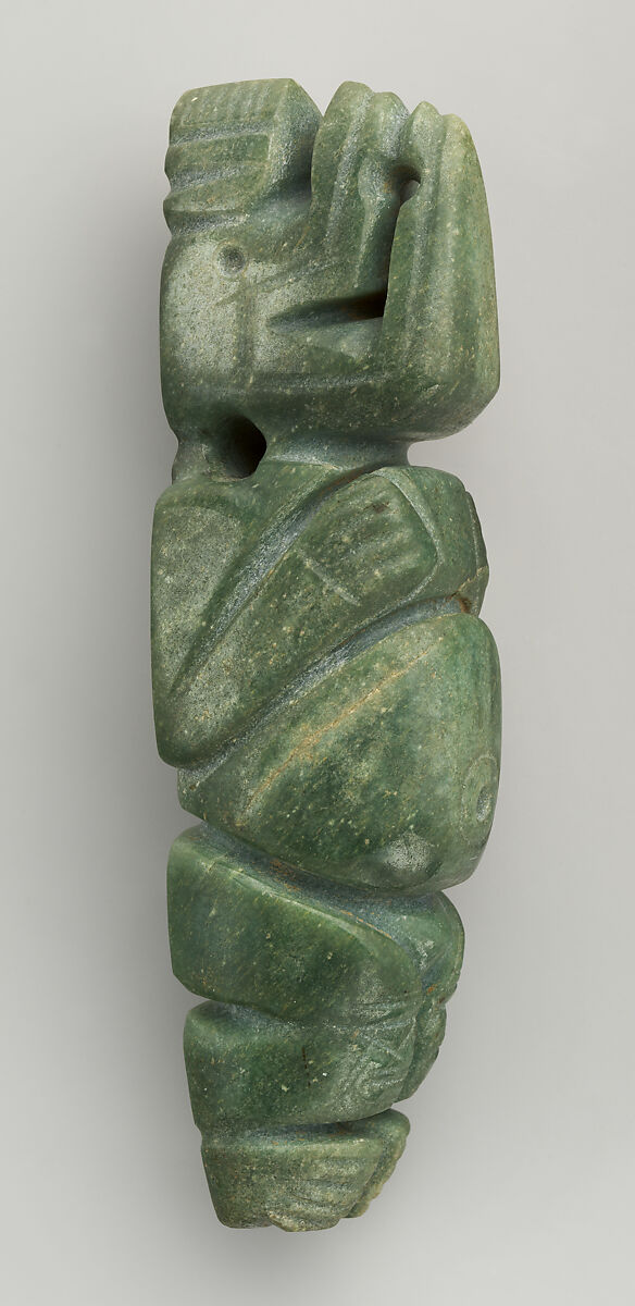 Excavations in Costa Rica have revealed that jade objects worn in life were consistently placed as offerings in burials; in some instances, they were found on the neck of the deceased. This standing masked figure with bent knees has arms raised to chest level, holding something between his hands or simply resting them on his plump abdomen. The figure is unclothed except for the mask, with its large upturned snout or beak and a tripartite crested headdress. Carved from a light green jade, shallow incisions and deep grooves interrupt the highly polished surface to delineate anatomy and ornament. A drill hole through the neck allows for suspension.