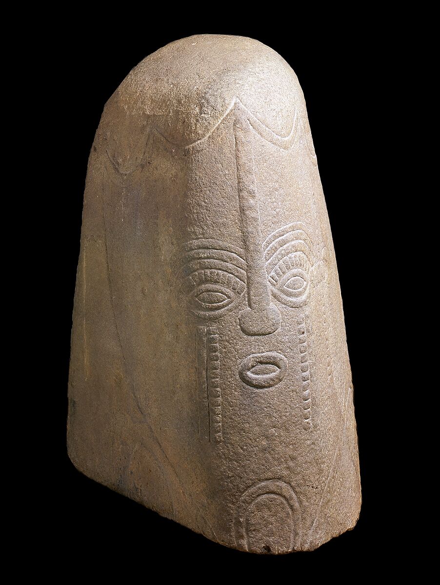 This particular example, with its elegant low-relief detailing around the eyes and the ornate cicatrization along the cheeks, led to its attribution to a class of objects created by members of the Nnam, one of eight clans that comprise the Bakor ethnic group of the Cross River region. Frequent motifs that appear on Nnam-style monoliths include a single spiral, double spiral, concentric circle, diamond, and triangle. This work is fragmentary and is the top half of what was originally a taller monolith. There is a clear differentiation between the sculpture's front and back, with the rear being devoid of inscription. The marks themselves refer to cicatrization patterns, which comment upon the wearer's level of initiation, ethnic, clan, and family identity. These markings may also relate to symbols that would have been painted on the body during festivals and ceremonies. All of the stones depict bearded figures, which suggest venerability and wisdom.