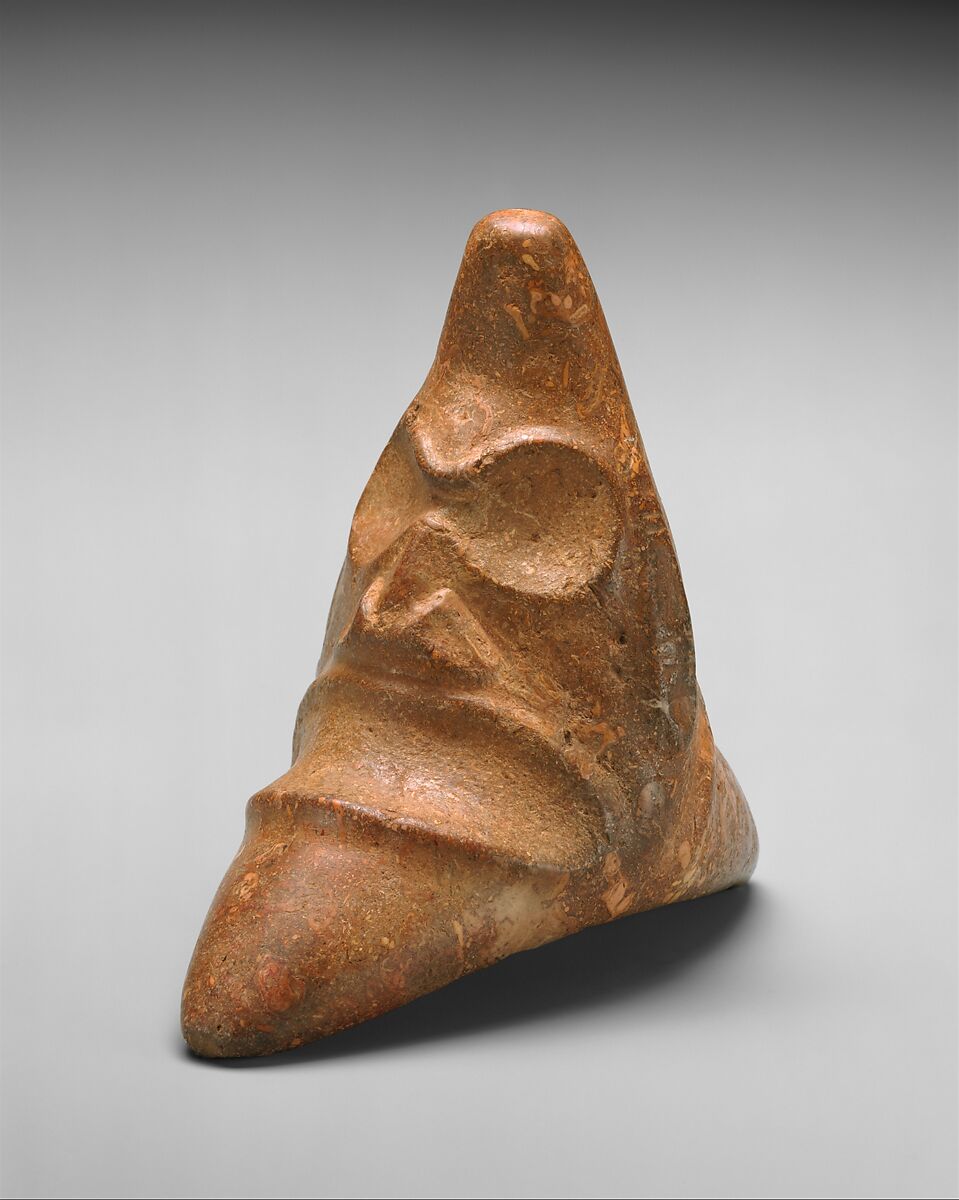 Portable-sized sculptures, known as three-pointed stones or trigonolitos, were described by the Spanish chroniclers as having a connection to yucca or cassava, a staple root crop in the Caribbean. Three-pointed stones come in various sizes, from handheld to quite heavy, and feature a diversity of imagery ranging from anthropomorphic and zoomorphic phone. They mainly come from the Greater Antilles, but examples have been found as far south in the windward islands as The Grenadines.