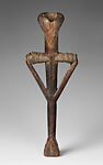 Carved from a single piece of wood, this flute is conceived as a stylized human figure with sharply bent arms. Small perforations at the tips of those arms serve as finger holes: while blowing into the V-shaped mouthpiece, the player covers or uncovers these holes to shift between the instrument’s available pitches. Leather bindings reinforce cracks caused by frequent handling and the humid savanna climate.