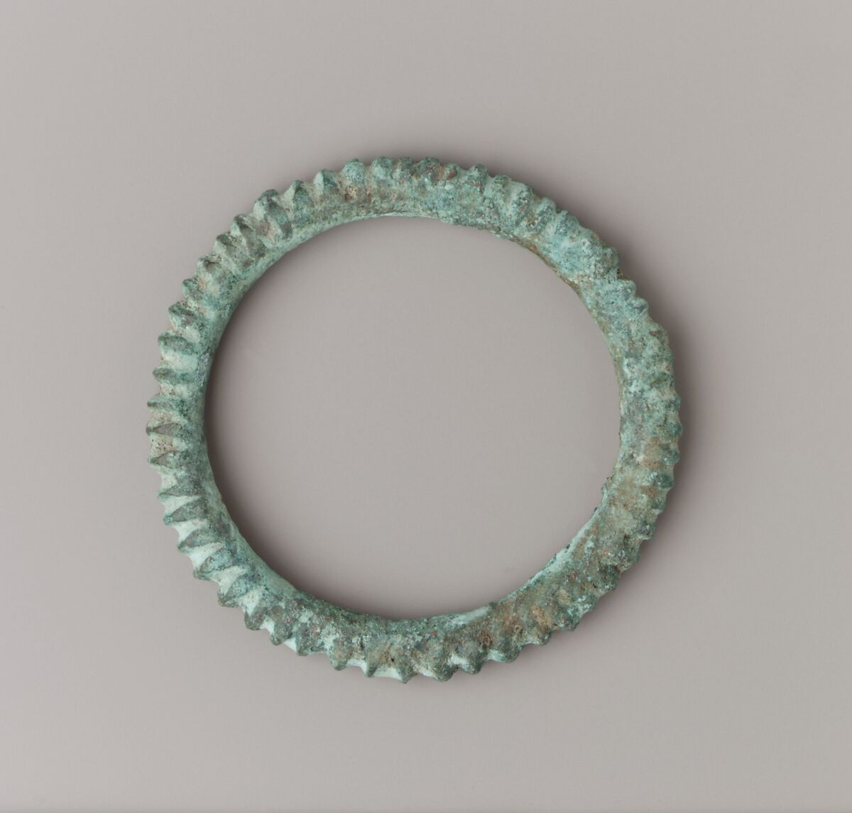 A copper-alloy adornment, this bracelet was created in the ancient center of Jenne. Jenne's central location on numerous pivotal trade routes contributed to its prosperity and the development of a complex and highly urbanized social structure. Copper metallurgy is believed to be an important antecedent to the iron technologies that were transforming West Africa and the Mande kingdom during this period. Terracotta figures from the thirteenth and fourteenth centuries from this region depict individuals wearing similar items of jewelry.