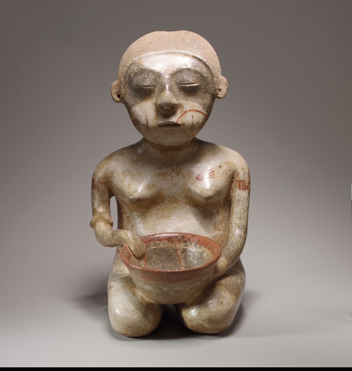 The pair are represented as complementary. Shown with the woman’s legs folded under her and the man seated cross-legged, they are nearly equal in size, with rounded stomachs and thin arms. Both are nude from the waist up, the women dressed only in a red skirt, the man in a red loincloth, each with red and black markings that may represent tattooing or body paint. Earlobe perforations indicate that both once wore ear ornaments, likely made of metal, clay, or feathers. Differences in gender, however, are clearly shown by the exposed breasts of the female and the male’s genitalia, evident through his loincloth. He sits with his hands resting on his thighs, while the woman holds a bowl with geometric designs, a sign of her domestic role within society.