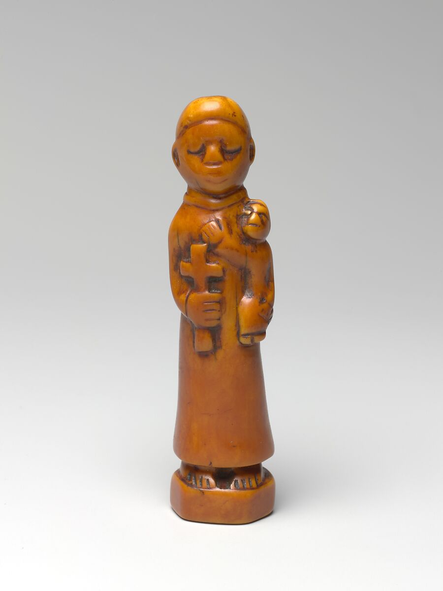 Catholic since the late fifteenth century, the Kongo Kingdom fostered devotion to many saints. St. Anthony was among the foremost, and was called Toni Malau (“Anthony of Good Fortune”) for his purported powers of healing and good luck. The figure’s attributes confirm his identity: the cross held in his proper right hand, the Christ child balanced on the low curve of his left elbow, and his simple habit. Although a researcher has suggested that the iconography of this figure is atypical, it is in fact consistent with later depictions of the saint (Object File, The Metropolitan Museum of Art). While earlier portrayals made by artists in Kongo and across the world show St. Anthony holding the Christ child on a book (as evident in the brass pendant, 1999.295.1), this feature was diminished or completely absent in later depictions.