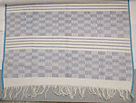 This wrapper has been hand-woven on the traditional Igbo Akwete woman’s vertical loom with machine spun cotton yarns and lurex. As is usual on Akwete cloths, the design motifs in this example are created by a supplementary weft structure on a warp-face plain-weave ground. The checkerboard design, woven on white ground, alternates with a series of four narrow bands all worked in lurex and blue dyed cotton yarn.