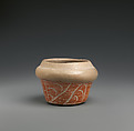 This red-orange and white bowl with a restricted neck, reportedly from Tlatilco, Mexico, contains abstract designs gauged in the red slip on the lower portion of the bowl.
