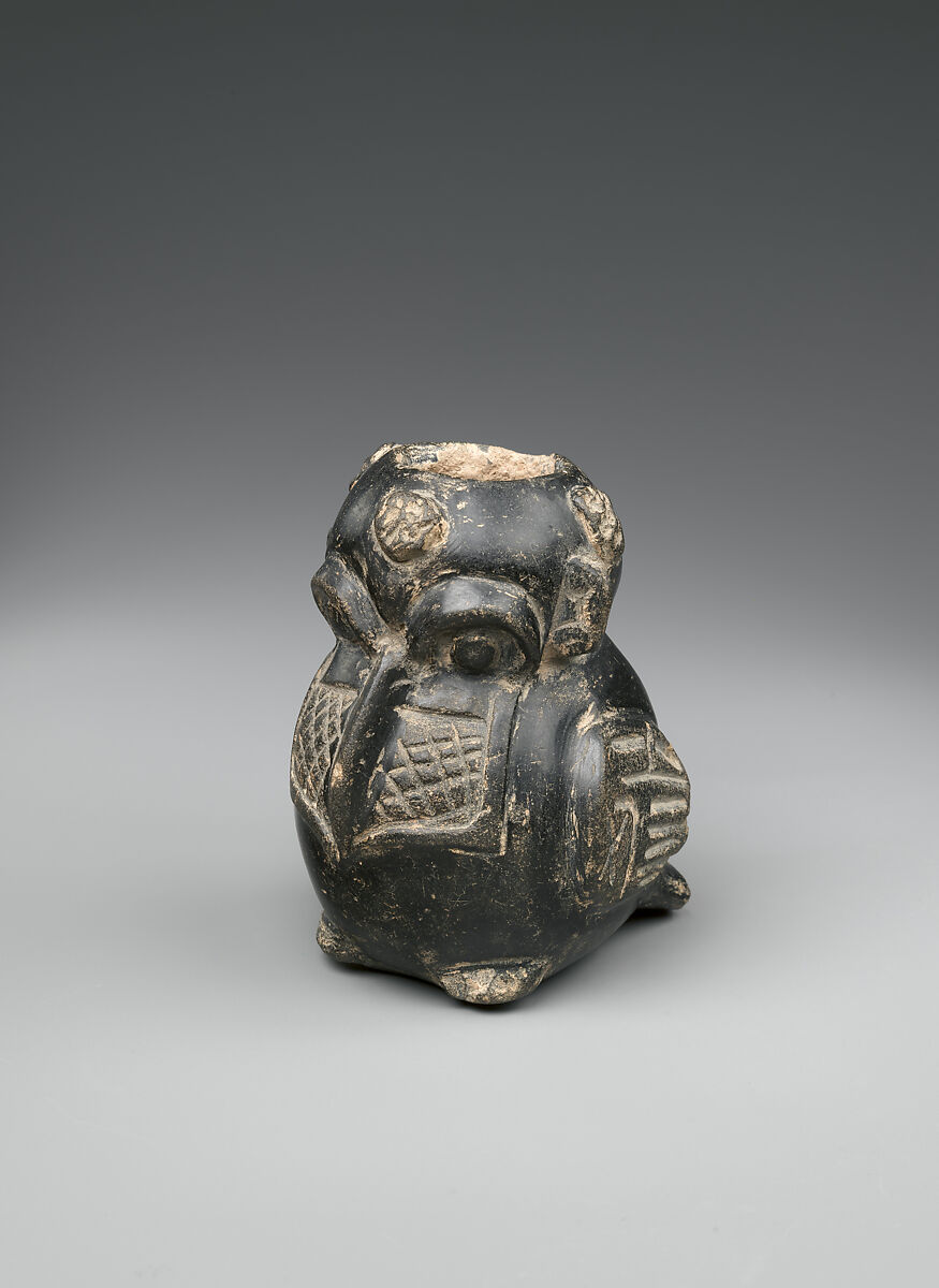 This small vessel is in the form of a bird, probably a sea bird, its long beak resting on its chest. Its wings, bearing incised geometric designs, are folded on the sides of its body. On its chest is a trapezoidal, bib-like ornament decorated with incised cross-hatching. The bird is anthropomorphized with round, staring eyes under prominent eyebrows and ears projecting from the sides of the head. On the front and sides of the forehead are appliqued circular incised elements. The surface is burnished except for the decorated areas which are roughened.
