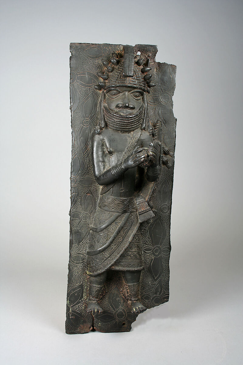 At its origins, the centralized city-state of Benin was founded by Edo-speaking peoples. The accounts by official court historians and descriptions provided by visitors evoke a vibrant cultural center continually redefined by its leadership through shifting internal and external power dynamics. According to oral tradition, circa 1300, Edo chiefs are reputed to have reached out to the leader of neighboring Ife, Oranmiyan, to establish a new divinely sanctioned royal dynasty. Since then, the investiture of Benin’s rulers to the title of obas has conferred upon them at once a role of chief priest officiating in important religious ceremonies and presiding over an elaborate structure of palace officials. During the fifteenth century reign of Oba Ewuare, Benin’s armies were formed and the fortification of its capital with a massive wall undertaken. In parallel, delegations of Portuguese traders assiduously sought to secure exclusive commercial treaties with this leader of the region’s most powerful polity. At its height in 1500, Benin’s authority extended to the Niger delta in the east and to the coastal lagoon of Lagos in the west. Its major exports of pepper, textiles, and ivory were exchanged for copious quantities of imported metals. This access to an influx of brass led to an explosion of creativity by court artists who transformed it into works for the palace ranging from ancestral portraits, positioned on royal altars, to decorative plaques depicting the oba, his courtiers, and foreign interlocutors. From the earliest such exchanges, those Europeans commissioned exquisite ivory artifacts from Edo carvers for princely collections back home.