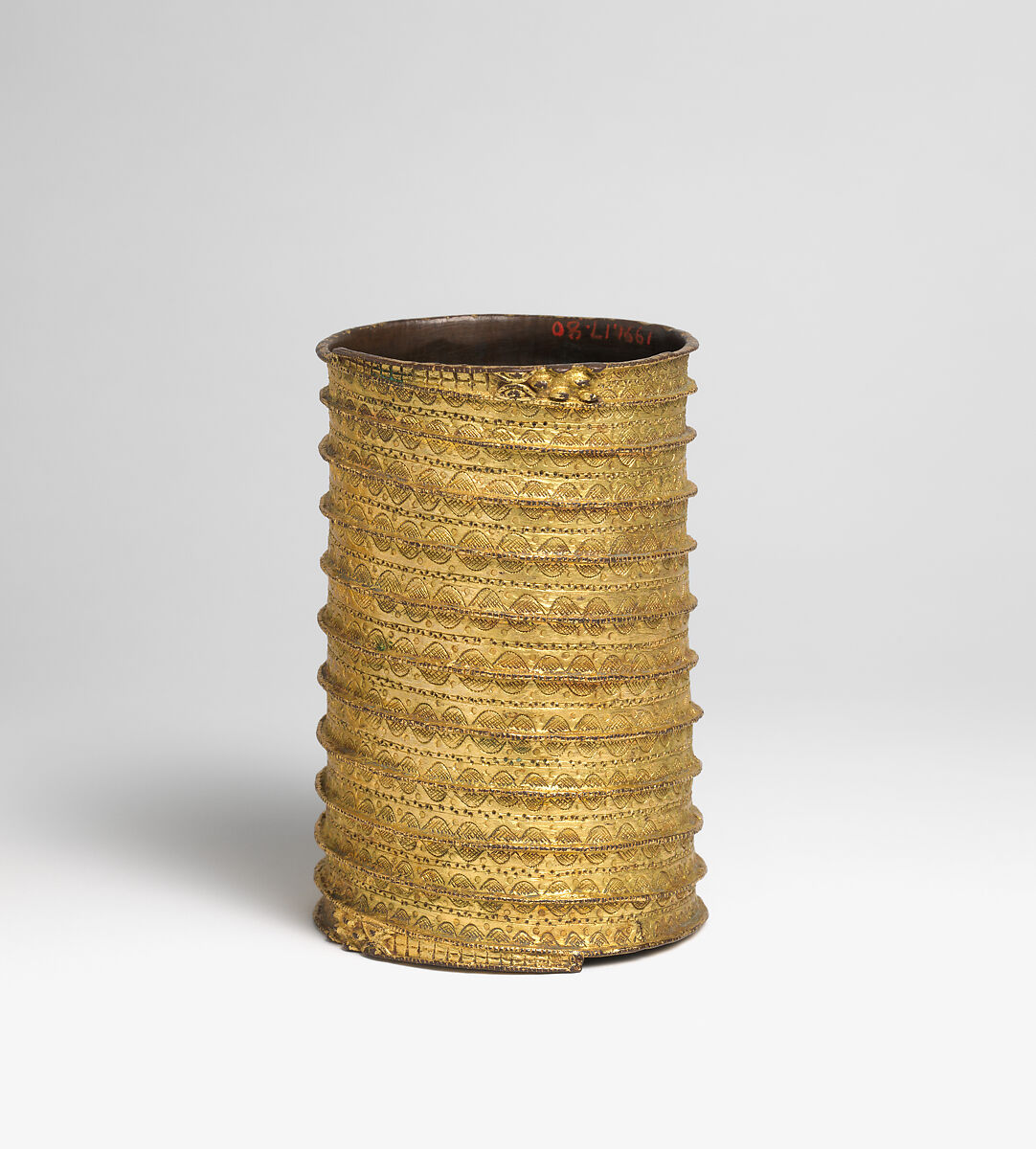 The surfaces of these bracelets are covered with a thin layer of gold, an unusual feature within a courtly tradition that rarely employed this precious metal. It is unclear when, or even if, the technique of gilding was introduced to Benin's brasscasters. Some scholars have suggested that a resident European craftsman may have been responsible for gilding these and other items at the court.