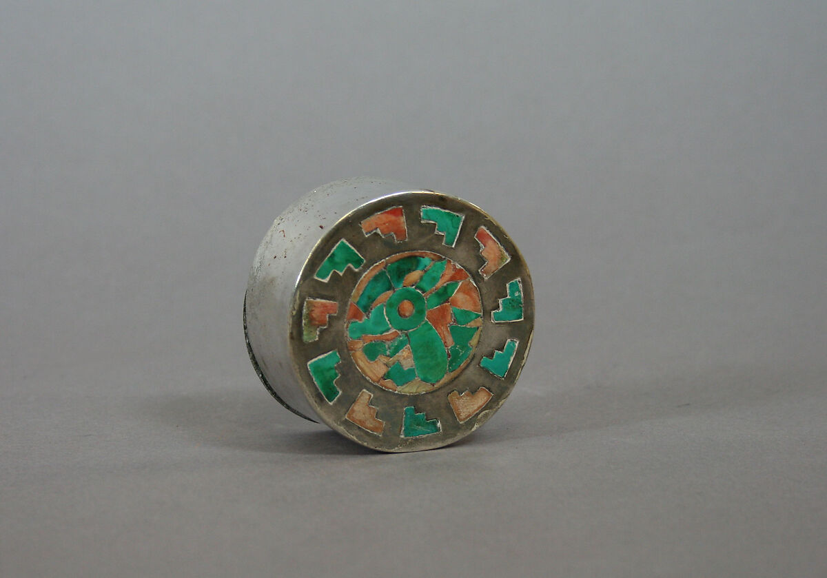 These two ear ornaments are drum-shaped with slightly incurved sides and contain clappers for creating sound. The frontals are inlaid with turquoise and shell forming a mosaic image of an animal figure in profile in the center with a serrated tail and crescent headdress. The animal is surrounded by alternating shell and turquoise step motifs. The reverse side shows the same zoomorphic creature with bared teeth in a roundel incised into the sheet silver on a finely stippled background.