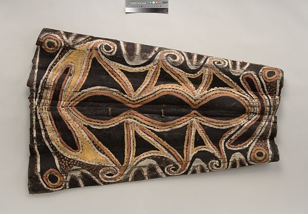 This panel is one of over 270 original paintings commissioned from Kwoma artists in the village of Mariwai in 1970 and 1973 by Douglas Newton, the first curator of Oceanic art in the Department of the Arts of Africa, Oceania and the Americas. Once completed, they were shipped to New York and installed in the galleries. In 2007, when the Oceania galleries at the Metropolitan Museum were renovated, the panels were attached to a new superstructure. Although less steeply pitched than the Kwoma houses found in villages today, the installation evokes the essential form of a ceremonial house ceiling. Together these suspended panels form an impressive and spectacular installation in the Metropolitan Museum which, at 80.4 feet (24.5 meters) end-to-end, is the largest contemporary art installation in the museum.