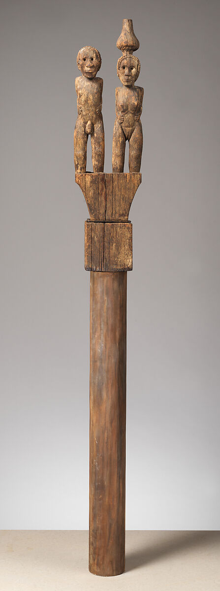 Set side by side, these figures engage the viewer with their intense expressions and deeply recessed eyes. Their subtle stylization simultaneously unifies them and amplifies what makes them different, producing an eloquent statement on the fundamental complementarity of man and woman. As the centerpiece of circumcision rights performed to promote the virility of each generation, the couple emphasizes the importance of the male-female partnership in assuring the community's future. The figures' nudity, striking in a region where textiles are a fundamental element of identity, serves to further underscore these timeless and universal themes of fertility and regeneration.