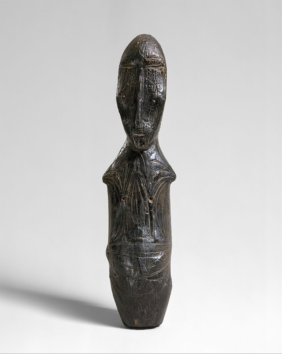 In the last two millennia before the Common Era, the peoples who established themselves along the rim of the North Pacific Ocean between Asia and America were dependent for their livelihood to a great extent on the resources of the sea. Walrus, seal, and whale were significant to subsistence, and all were hunted. On the American side, the Bering Sea Eskimo were careful to decorate the ivory and wood tools with which they hunted. The beautifully balanced and elegantly incised objects were functional tools that were incised with spirit images and designs that honored the animals the hunters sought. Harpoon heads and foreshafts, and the socket pieces known as winged objects are salient examples. Also carved of walrus ivory were human figures, most frequently female. The purpose to which the enigmatic but equally elegant figures were put is unclear. Some authorities call them dolls-originally, they may have been dressed-while others call them ceremonial objects.