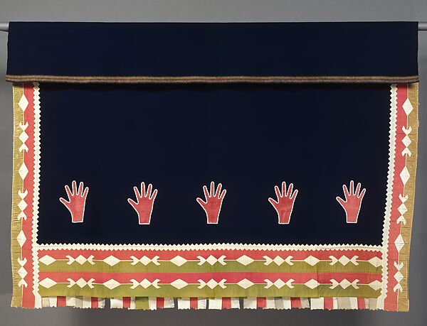 With its five simple yet powerful hand motifs, which symbolize friendship, this Osage woman's wearing blanket is a splendid example of Native American textile art. Large wearing blankets with ribbon-appliqué borders, such as this one, developed in Oklahoma around the turn of the twentieth century, particularly among the Osage and Oto peoples. They reached a peak in production during the height of the oil boom in Oklahoma in the 1920s and 1930s. During this period, Osage families made substantial sums from the oil on their lands, and their lifestyle became increasingly comfortable. Accompanying this prosperity was an elaboration of dress that marks the high point in Osage fashion. Beautifully patterned wearing blankets like the present example became a necessity for all important occasions. Draped across the back and folded across the shoulders, such blankets are still worn today by prominent Osage women.