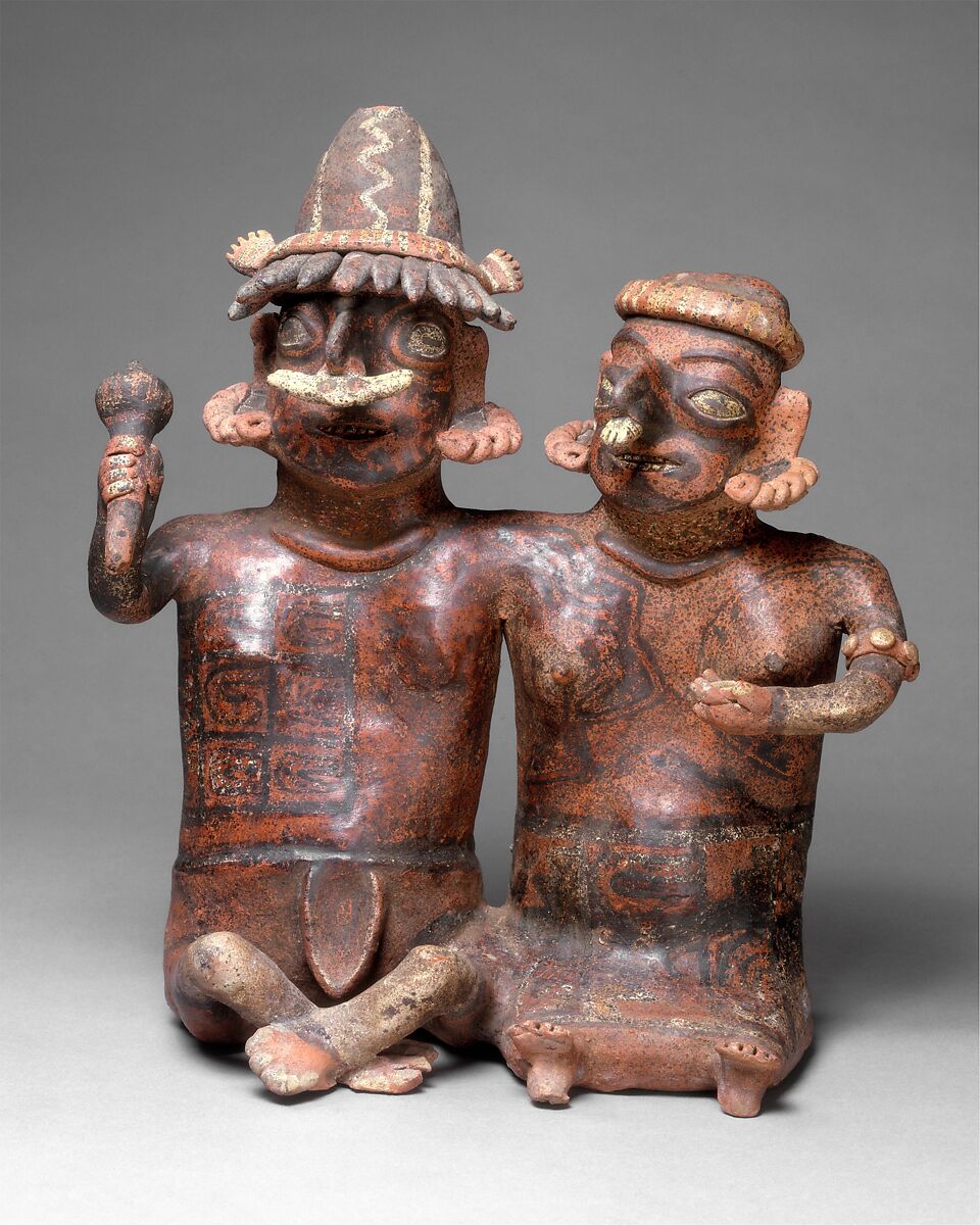 These large, hollow ceramic male and female figures, joined at the shoulders and hips, are thought to represent important ancestors of an ancient West Mexican community. The male is seated cross-legged, and wears a cape or mantle with a slip-painted pattern. His loincloth features an attached, scoop-shaped genital protector. He wears a conical hat with a zig-zag design and a lower fringe, and holds aloft a rattle or conch shell in his right hand. The female sits with legs extended and wears a full-length skirt with traces of an elaborate design. Her left arm is adorned with a band featuring five round elements and she holds small bowl up to her chest. Prominent nose and ear ornaments grace both figures.