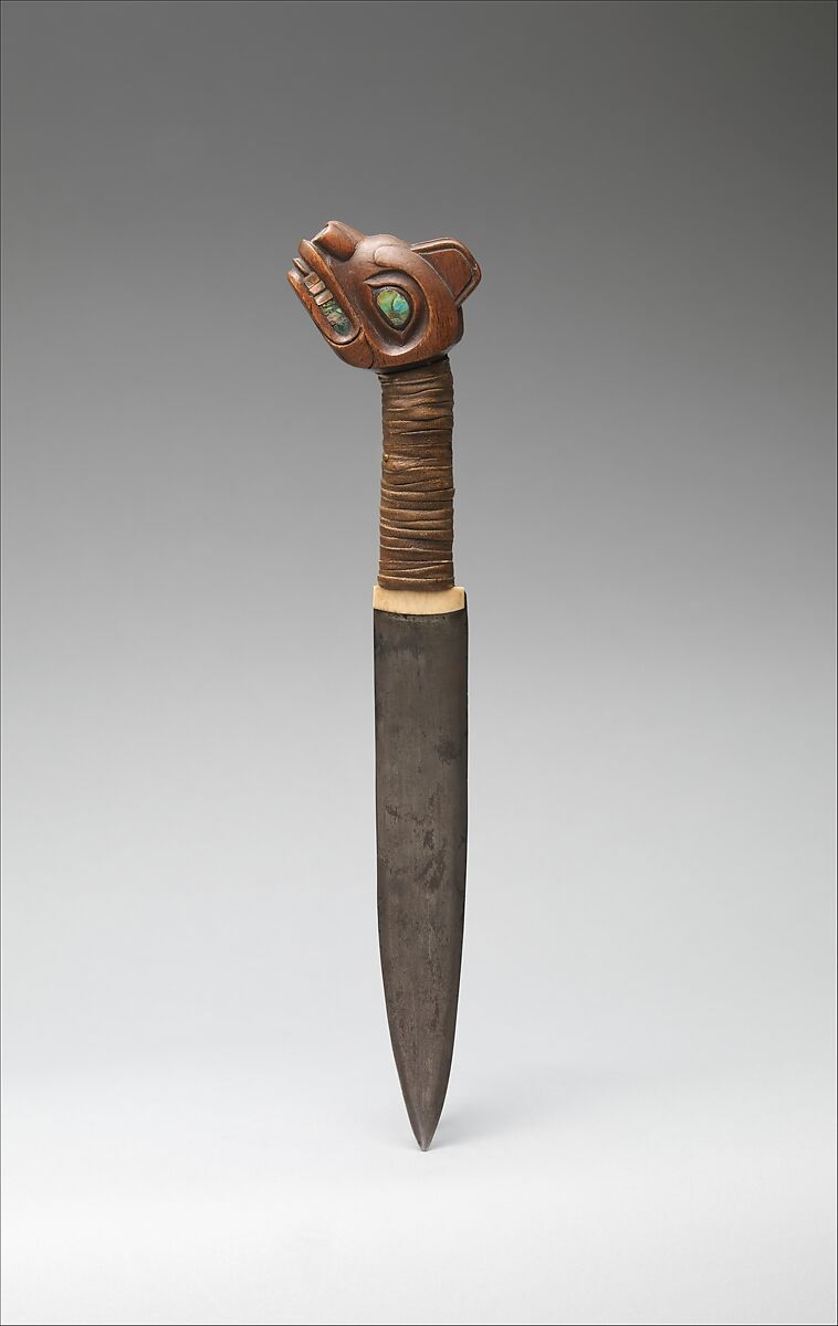 - Medium:Wood, metal, abalone shell, ivory, Native-tanned skin