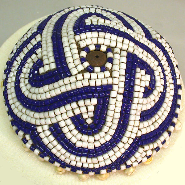 Across communities in the Congo Basin, enormous creative innovation has been channeled into the design of headgear. Often their owners’ most valued apparel, such prestige caps revealed an individual’s erudition, cultural affiliation, marital status, and political stature. Among the Kuba, a succession of increasingly complex versions of the four-lobed laket mishiing are worn following initiation into manhood. The basic coiled and woven raffia fiber cap is the foundation for a vibrant array of fashions, including those embellished with bold graphic patterns, colorful embroidery, twisted raffia projections, and wealth in the form of imported beads and cowrie shells. Over time, these personal accessories might undergo further modification and enrichment through the addition of luxurious plumage and elegant carved hairpins.