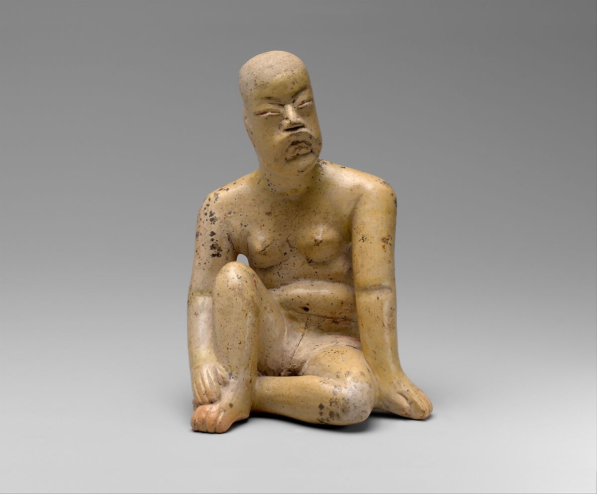 This figure is a fine example of type of small three-dimensional solid clay figures found at such sites as Las Bocas, Tlatilco, and Tlapacoya in the central highlands of Mexico. These figures exhibit a remarkable uniformity in style, but no two are the same. With their fleshy torsos and lively facial expressions shown in active, often animated poses, the works are the most naturalistic renditions of the human form in Precolumbian Mexico.