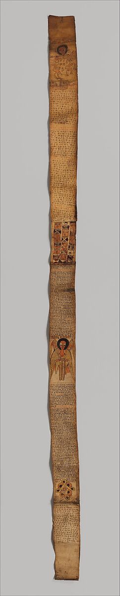 Ethiopian healing scrolls use written prayers and talismanic imagery to combat demons that cause illness. This scroll was constructed from four pieces of parchment sourced from a ritually sacrificed animal. The preparation and viewing of the scroll are equally vital parts of the healing process. The talismans on this example are rendered in washes of red, black, and green, their sketchy, rounded outlines lending the work an overall linear simplicity. In the uppermost talisman, a youthful, beardless saint rides a rearing horse. His bare toes wrap around an Ethiopian toe stirrup as he points his spear upward in the pose of the victorious knight of Christ. Images of saints were popular in Ethiopian Christian art for their association with spiritual intervention. This example may illustrate Saint Tewodros, who was commonly depicted astride a red horse.