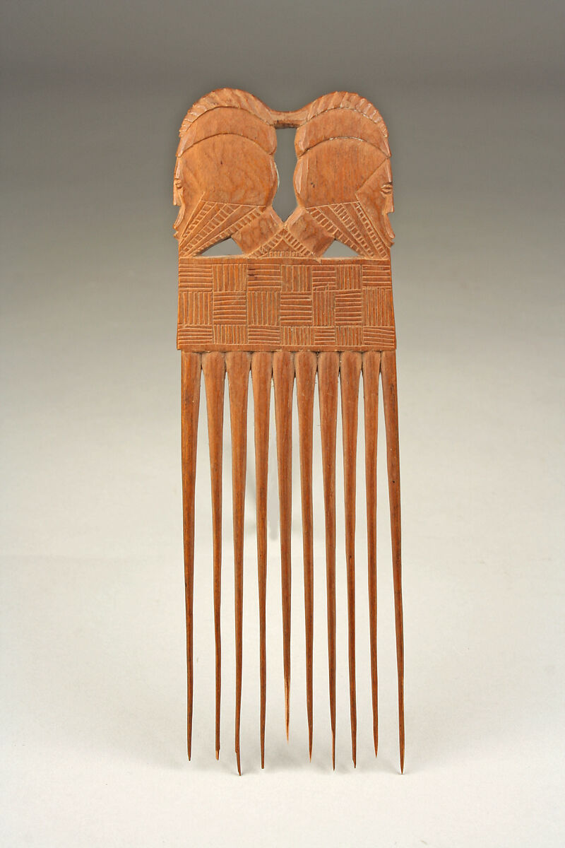 The design of two male heads back-to-back is typical of Kaniet men’s combs. While women wore their own combs, these were usually patterned with geometric designs. Women were also not permitted to touch a man’s head or hair.Artwork Details
