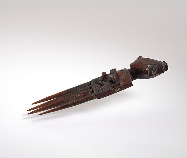 This figurative wooden comb (yisanunu) was worn by a high-ranking Yaka man as a symbol of his status. At the summit of its head is a projection in the shape of a bovine head with incised oval eyes and nostrils. This projection likely depicts a coiffure or headdress associated with a high-ranking male, among whom certain headgear was a symbol of status. The "body" or grip of the comb is a flat square ornamented with incised geometric designs of triangles and hatching; unusually, it also contains the face of the comb. The face is signified by a projecting fore head and a bulbous, upturned nose with a snub end. The mouth is slightly curved, with slender lips. Set into deep cavities, the rounded eyes are punctuated at the center by a deep horizontal line, which gives the impression of eyes narrowed in concentration. Vertical rectangles representing the ears project from alongside the eyes. The upper face is encircled by a deeply incised half circle that ends at the edges of the nostrils, a division representative of the hairline. Block-like ears project from either side of the head. The patterns on this example consist of sets of parallel lines bounding alternating plain and hatched triangles. Three thick teeth of equal length project from the grip, tapering into soft points. The surface of the comb is primarily smooth, and deep red-brown.