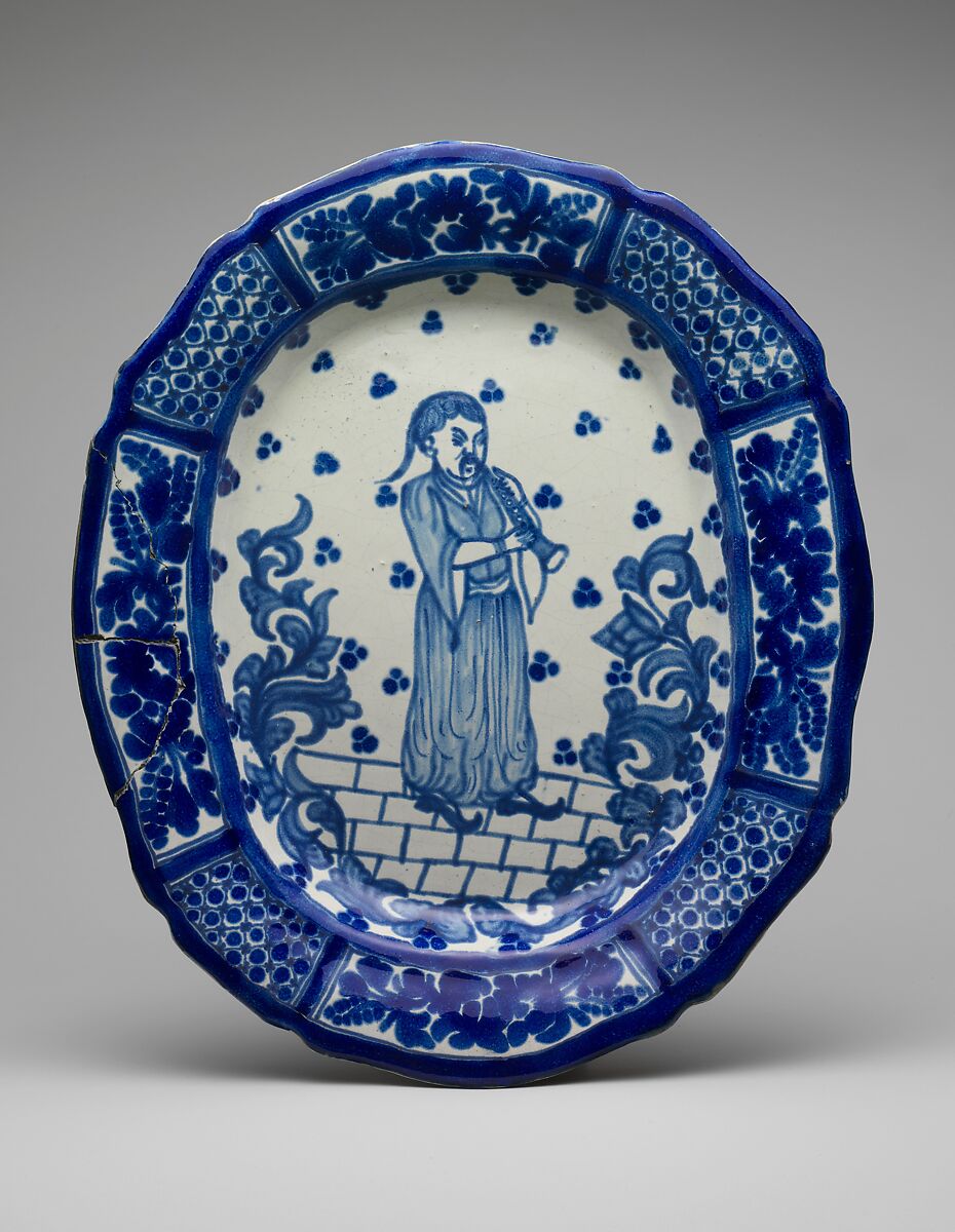 The Chinese influence in "Talavera Poblana" was brought about by the importation of late Ming and early Qing blue and white Chinese porcelain into Mexico through Acapulco. The first style is characterized by dominant blue designs with white reserved decorative panels. The second style features Chinese figural decoration outlined in blue on a white surface. The third style illustrates European figural decoration with Chinese details. The fourth style exhibits alternating blue and white shapes decorated with floral motifs and white reserves forming silhouettes.