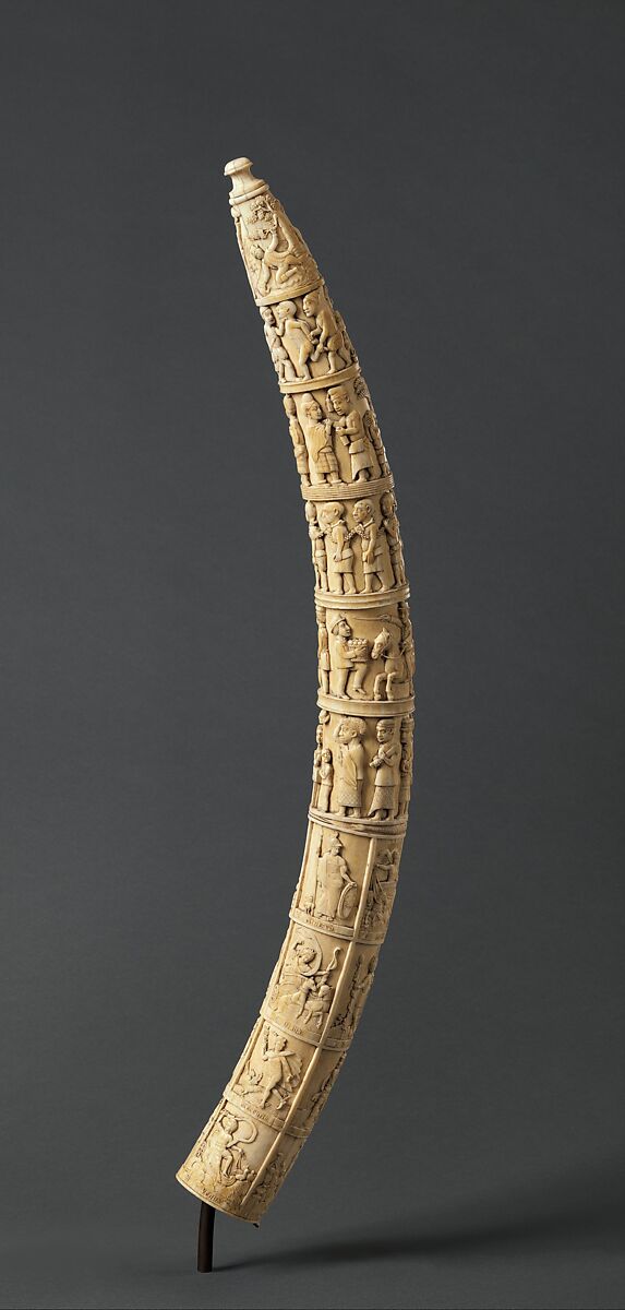 Two distinct casts of characters, rendered in disparate styles, fill the surface of this colossal elephant tusk. Scenes descend from the tip in a spiral that mirrors Kongo notions of the luzîngu (life cycle). These present the brutality of the slave trade, beginning with the violence of capture. Vignettes depicting the forced removal of individuals in bondage are interspersed with those of negotiations between regional chiefs and European merchants, in which textiles feature prominently. The base of the tusk, which has been laid out in a grid, is executed in a shallower, more linear style that suggests the hand of a second carver. That segment depicts the gods and goddesses of the Roman calendar, a subject likely adapted from printed materials provided by a European patron. The repeated violent nature of the quotidian interactions depicted by the artist provides an incisive critique of European exploitation.