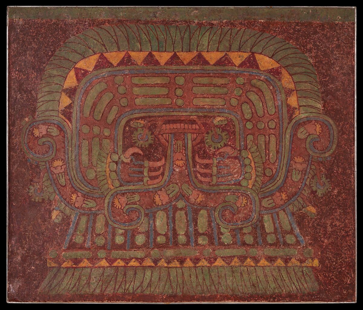 The fragment shows a highly abstract depiction of what may be a deity, or perhaps even an elaborate, undeciphered hieroglyphic logogram (a sign representing a word). The symmetry of the figure and the location of a toothed mouth and clawed hands suggest a stylized anthropomorphic being. From the mouth emerges scrolls covered in images of flowers, perhaps a visual representation of "flowery speech" or benevolent oration. The figure is covered in circular and ovular shapes painted green—mostly likely images of jade beads—and fringed with green feathers; both greenstone and green feathers were luxurious imported materials. The green color evokes water, maize plants, and agricultural fertility.